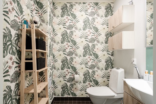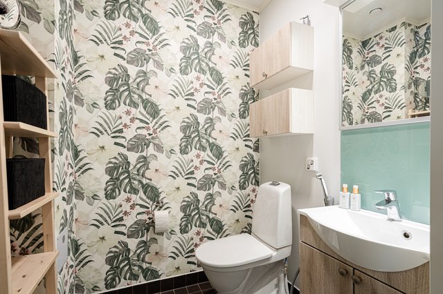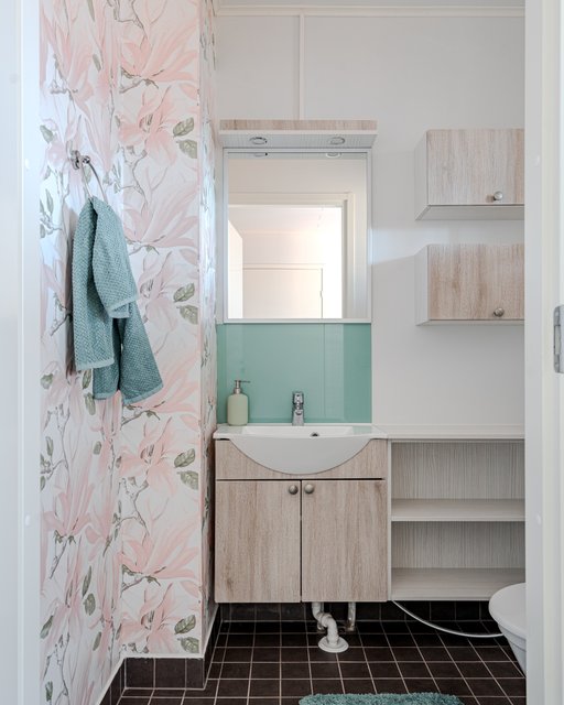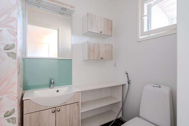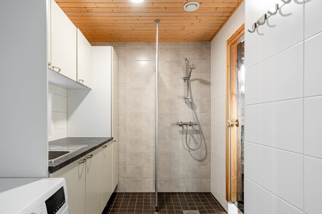 - Suihku, suihkuseinä, lattialämmitys, pesukoneliitäntä, pesuallas, ja allaskaappi