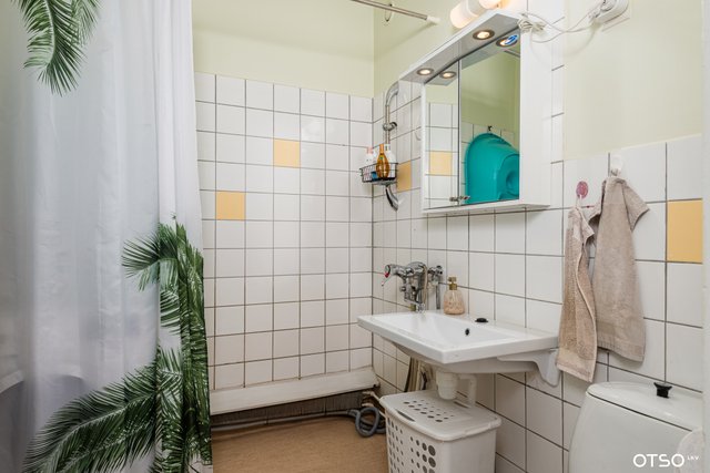- WC-istuin, suihku, pesukoneliitäntä, peilikaappi, ja pesuallas