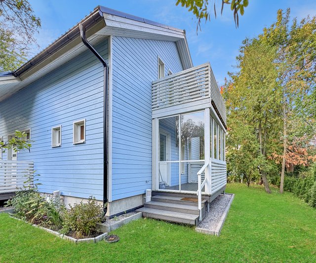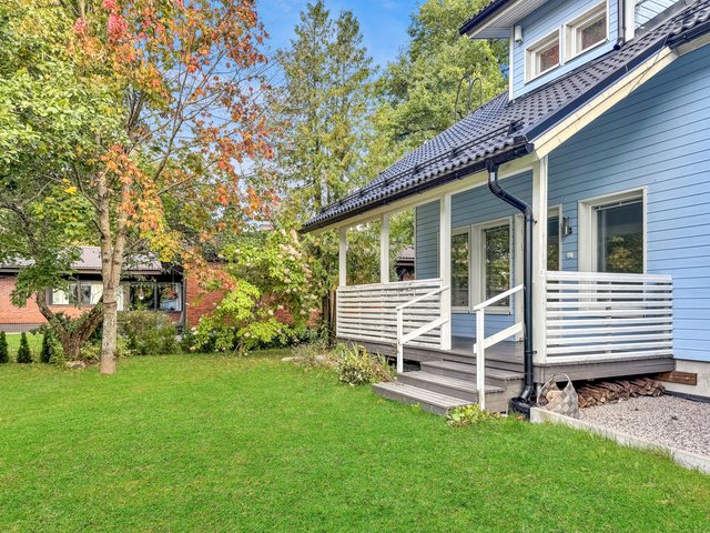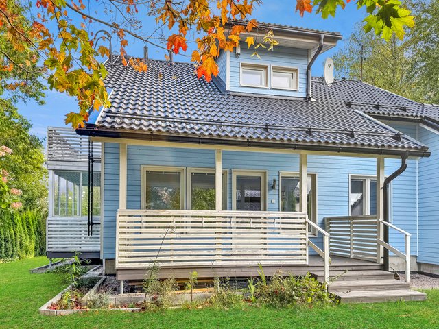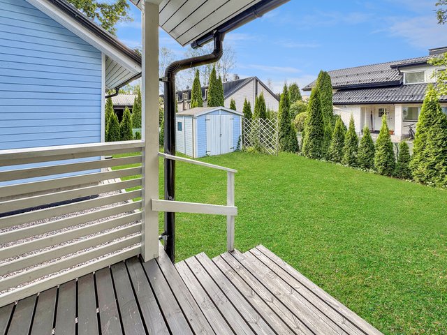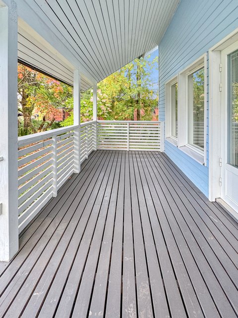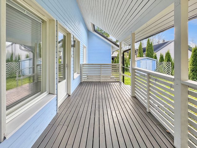 - Olohuoneesta käynti katetulle terassille. Kodinhoitohuoneesta on käynti lasitetulle terassiparvekkeelle, josta on käynti pihalle.