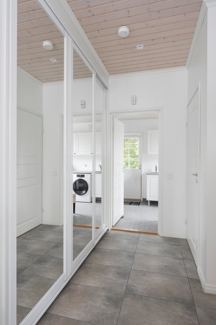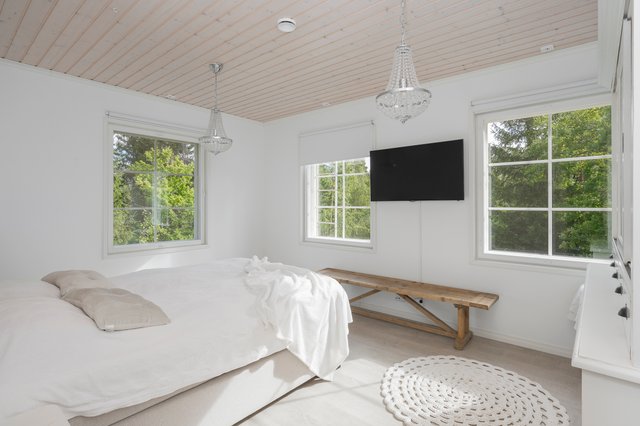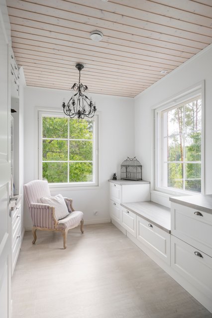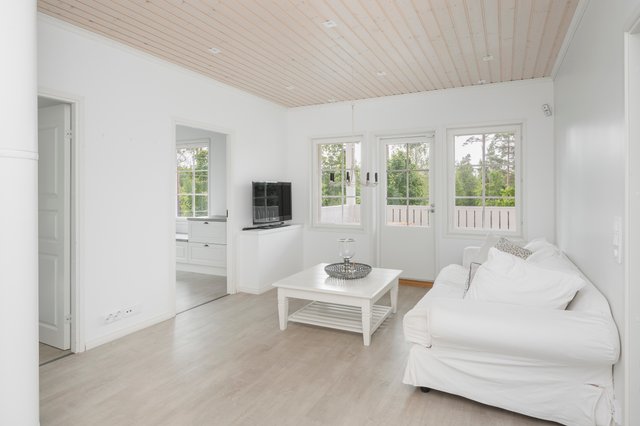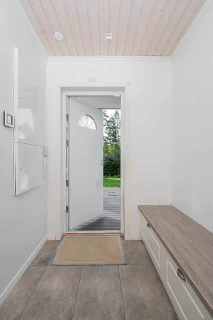 - Sisäkatot on vaaleaksi maalattua paneelia. Jokaisessa asuinhuoneessa on katossa led-valaisimet. Olohuoneessa on himmennettävät led-valot katossa.
