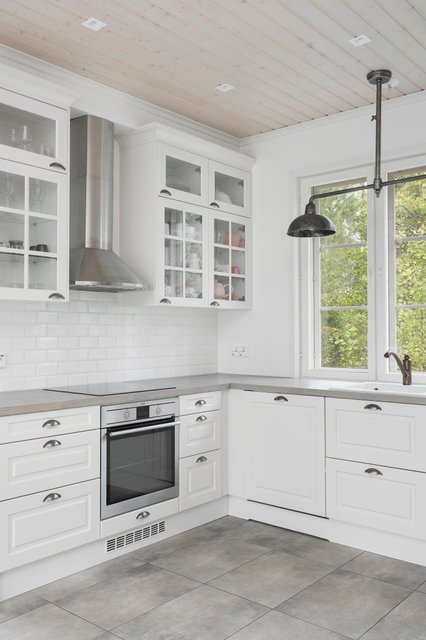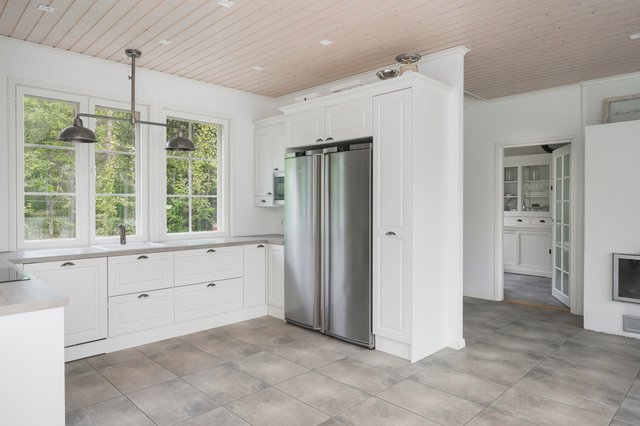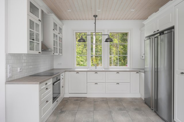 - Suuri ja avara avokeittiö. Keittiömaailman valkoiset kaapistot, harmaa kuvioitu laminaattitaso sekä AEG´n rosterinen jääkaappi-pakastin.