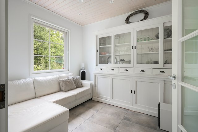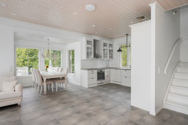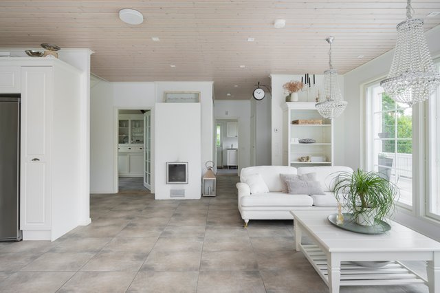 - Avarassa olohuone-avokeittiössä on ikkunoita pohjoiseen, etelään ja länteen. Koko alakerran asuintiloissa on helppohoitoinen klinkkerilattia. Olohuoneessa on varaava takka sekä hyvin tilaa kahdelle sohvalle.