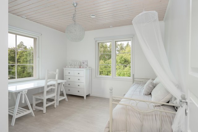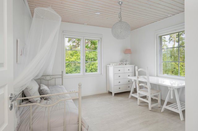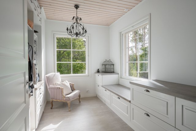 - Makuuhuonetiloja talossa on jopa viisi. Alakerrassa yksi ja yläkerrassa neljä. Tällä hetkellä alakerran makuuhuone on kirjasto-/tv-huoneena ja yksi yläkerran makuuhuoneista toimii unelmien suurena vaatehuoneena - walk-in-closetina. Vaatehuoneessa sekä kahdessa yläkerran makuuhuoneessa on kiinteät vaatekaapistot.