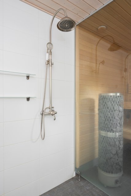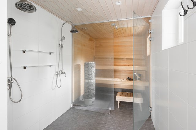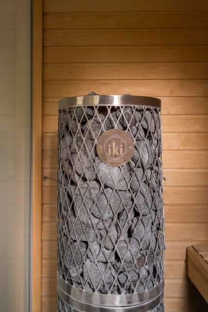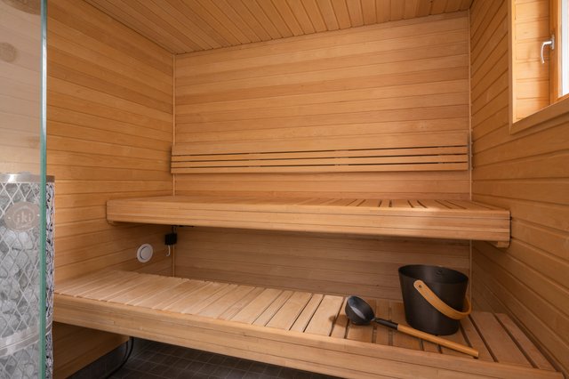 - Tilava sauna, jossa Iki-kiuas ja suuri lasiseinä kylpyhuoneeseen.