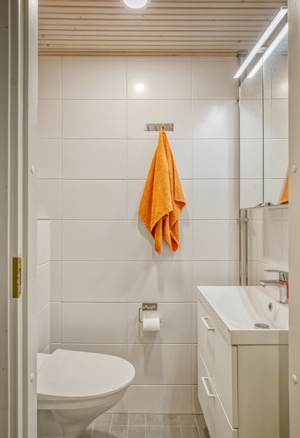 - WC-istuin, suihku, suihkuseinä, lattialämmitys, peilikaappi, allaskaappi, ja bidee-suihku