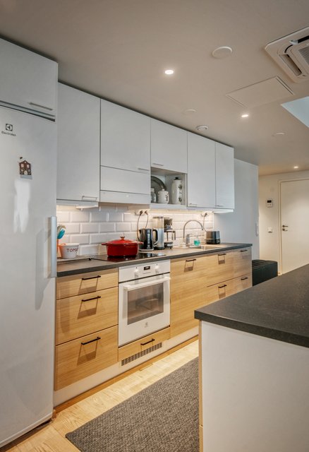 - Jääkaappipakastin, astianpesukone, liesituuletin, keittiösaareke, erillisuuni, ja liesi