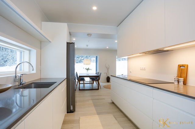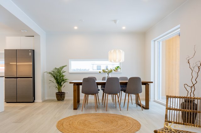 Talossa on tehokas pohjaratkaisu kolmella makuuhuoneella. Sisääntulokerroksessa on valoa tulvillaan oleva olohuone isoine ikkunoineen sekä reilunkokoinen ruokailutila suurellekin seurueelle. Avokeittiö on laadukas ja tyylipuhdas kokonaisuus. Alakerrassa lisäksi kylpyhuone, eteinen ja varasto.