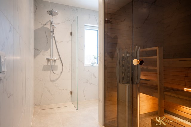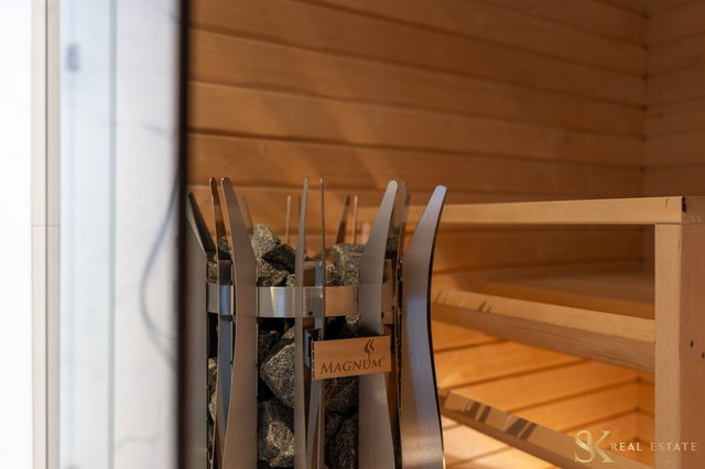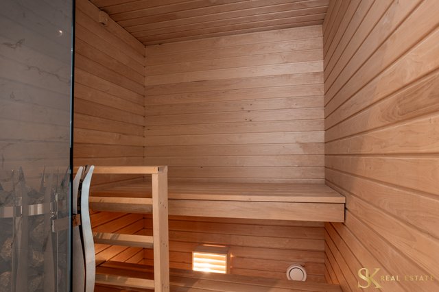- 2. kerroksen kylpyhuoneen yhteydessä oleva sauna lasiseinällä. VARUSTUS: Sähkökiuas, lauteet. SEINÄT: Leppäpaneeli/lasi. LAUTEET: Leppäpaneeli. LATTIA: Laatta.