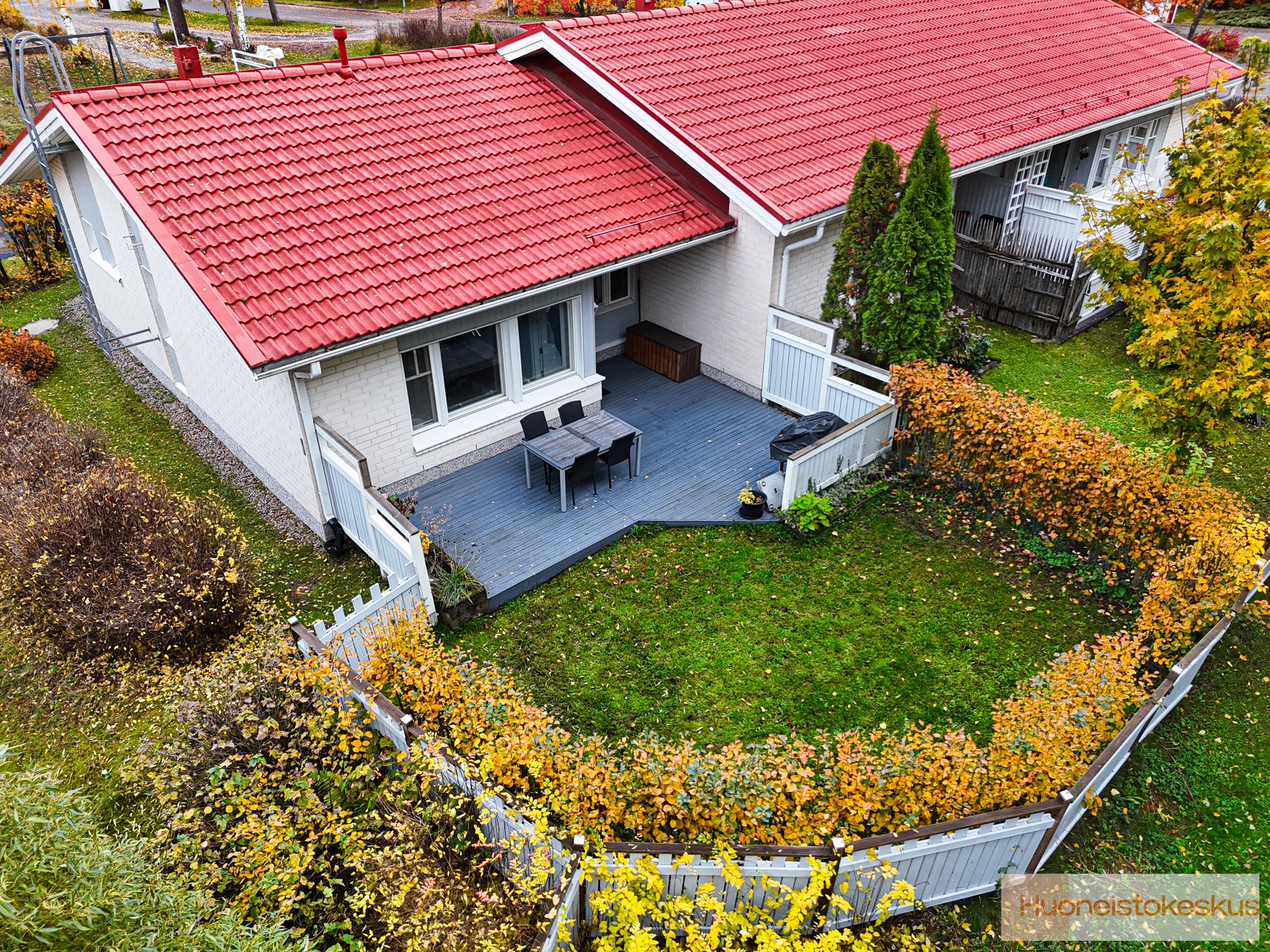 - Osittain katettu hyvän kokoinen terassi, josta pääsee aidatulle takapihalle.