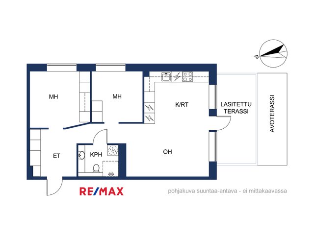 - Asuinpinta-ala 59 m2 Lasitettu terassi 12 m2 Avopatio noin 8 m2