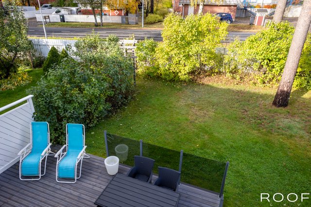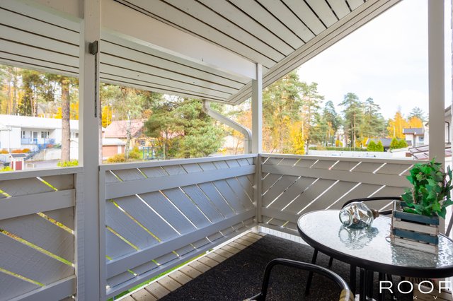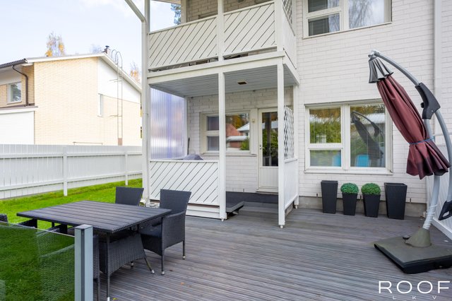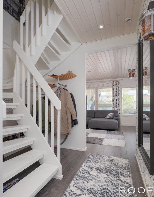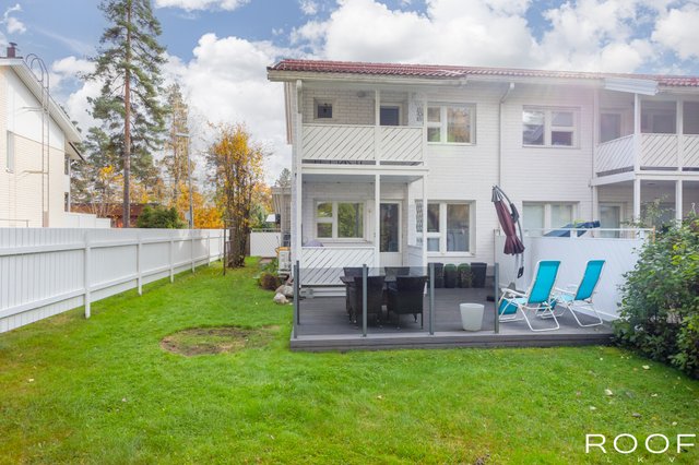 Alakerrassa on keittiö, erillinen wc sekä olohuone, josta on kulku suurelle, aidatulle terassille ja takapihalle. Yläkerrassa sijaitsevat kaksi makuuhuonetta, vaatehuone, pesutilat ja sauna. Toisesta makuuhuoneesta on käynti parvekkeelle.