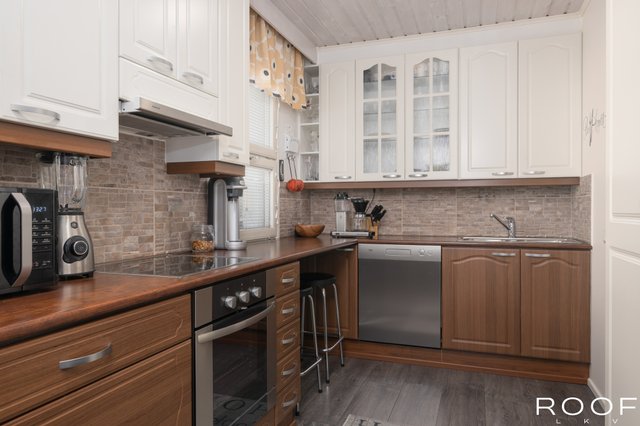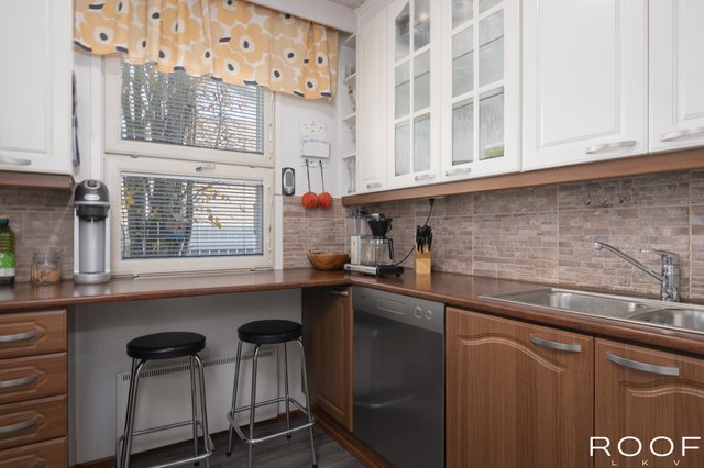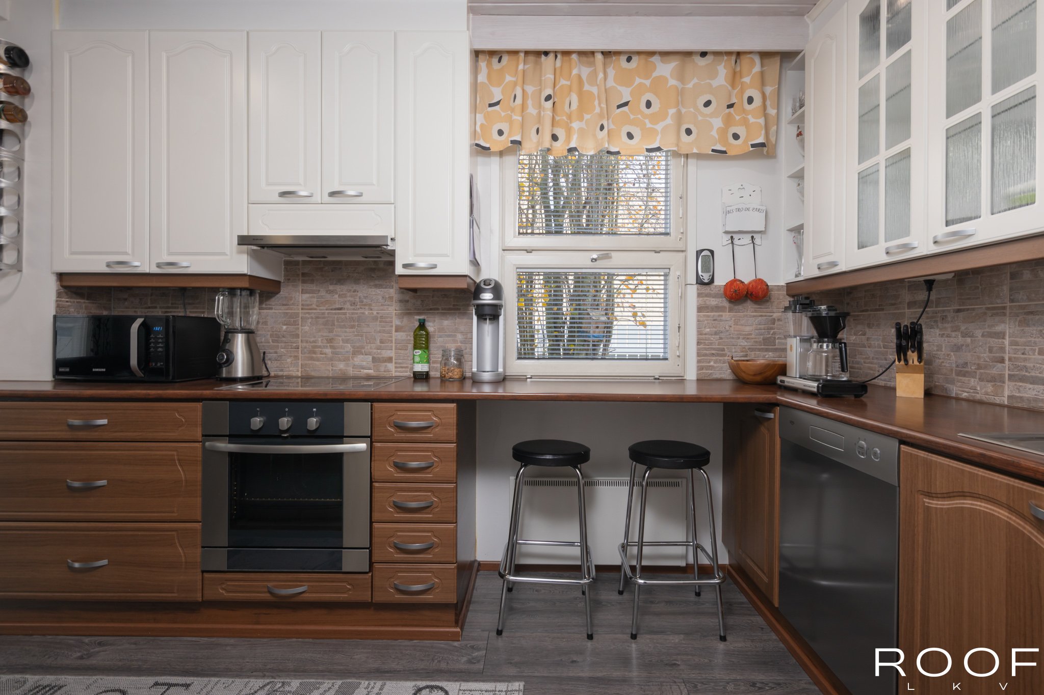 - Varustus: Keraaminen liesi, Liesituuletin, Uuni, Hana, Kaapisto, Allas, Astianpesukone, Jääkaappi, Pakastin Seinämateriaali: Maali Lattiamateriaali: Laminaatti