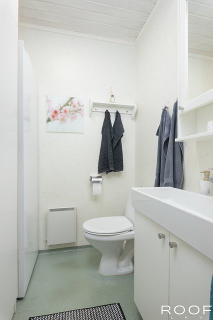 - Varustus: Suihku, Suihkuseinä, Wc istuin, Pesukoneliitäntä, Hana, Allas, Peilikaappi, Allaskaapisto, Lattialämmitys, Bidesuihku Seinämateriaali: Laatta Lattiamateriaali: Laatta