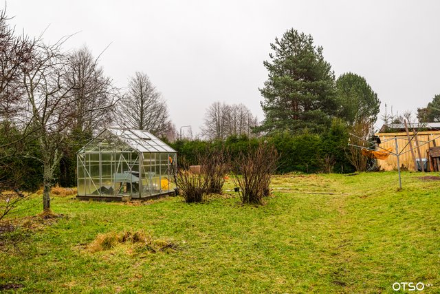 Reilunkokoinen piha, mahtuu monenlaista. Autotalli ja varastotilaakin on.