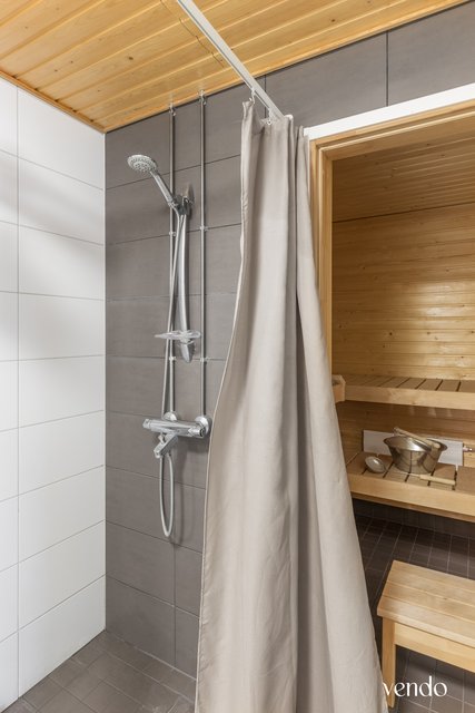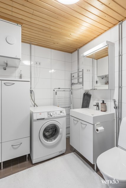 - WC-istuin, suihku, pesukoneliitäntä, peilikaappi, allaskaappi, ja bidee-suihku
