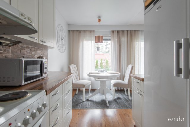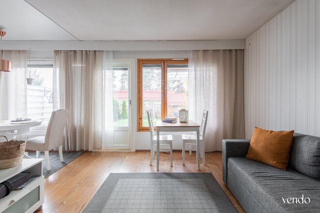 Kodissa on käytännöllinen pohjaratkaisu, jossa keittiö ja olohuone muodostavat viihtyisän kokonaisuuden. Olohuoneesta on käynti omalle suojaisalle terassille ja takapihalle, jossa voit nauttia rauhassa aamukahvit tai viettää aikaa grillaten. Oma sauna lisää asumismukavuutta vuoden ympäri.