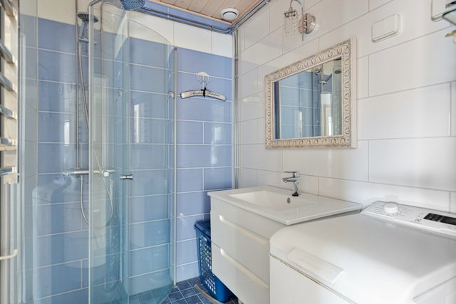- Pesukoneliitäntä, suihku, suihkuseinä, lattialämmitys, allaskaappi, ja peili