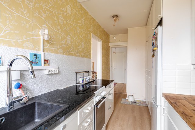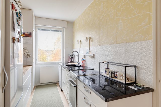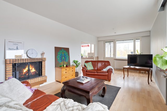 Ylimmän kerroksen iso kulmahuoneisto loistosijainnilla keskustassa, kaikki palvelut ovat kävelymatkan etäisyydellä.  Tämän kodin sydän on hulppean iso olohuone, jossa takka luo tunnelmaa tilaan. 2018 remontoidussa keittiössä on runsaasti kaappitilaa. Viehättävä ruokailutila yhdistyy kivasti olohuoneeseen.