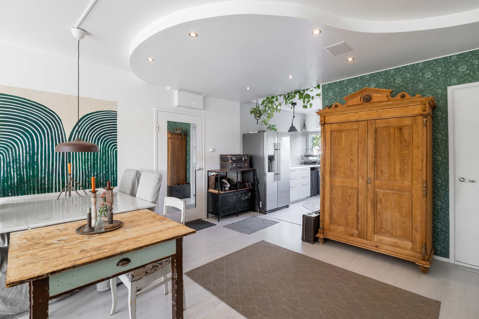 Läpitalon pohjaratkaisu tuo runsaasti luonnonvaloa eri vuorokaudenaikoina ja tekee kodista avaran sekä viihtyisän. Tilava olohuone kutsuu rentoutumaan ja reilunkokoiset makuuhuoneet tarjoavat hyvät puitteet sekä arkeen että rauhalliseen lepoon. Keittiö on käytännöllinen ja toimiva. Asunnossa on myös runsaasti säilytystilaa. Lasitettu länsiparveke vehreine näkymineen toimii kesäkeitaana.
