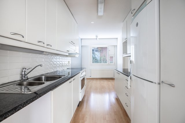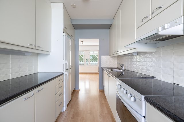 - Jääkaappi-pakastin, liesi, uuni, astianpesukoneliitäntä, liesituuletin, kaapistot, tasot. Laminaattilattia.