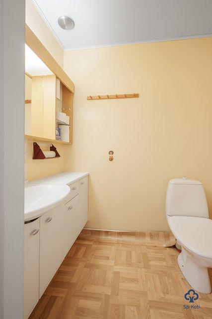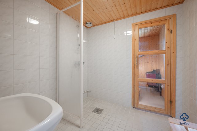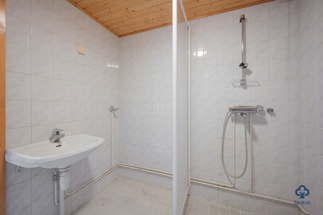 - Suihku, suihkuseinä, pesukoneliitäntä, pesuallas, ja lattialämmitys