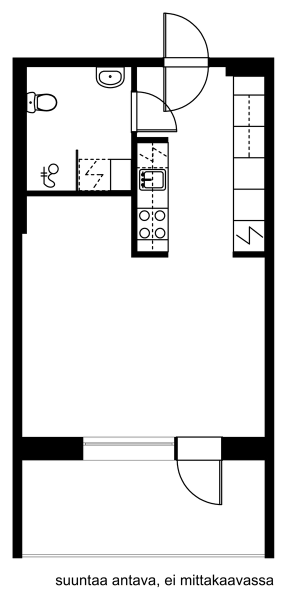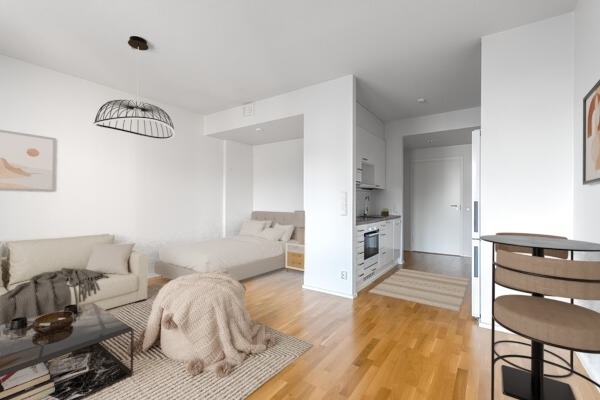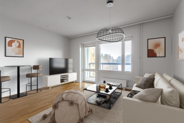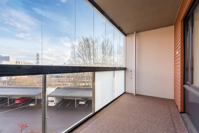 Valoisa yksiö Kilon juna-aseman läheisyydessä. Tässä kodissa on selkeä ja toimiva pohjaratkaisu. Olohuoneesta on käynti huoneiston levyiselle lasitetulle parvekkeelle.