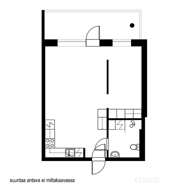 Tässä kodissa on selkeä ja toimiva pohjaratkaisu. Keittiö/olohuone yhdistelmästä on käynti huoneiston levyiselle lasitetulle parvekkeelle. Runsaasti kaappitilaa sekä tilava wc/kylpyhuoneyhdistelmä.