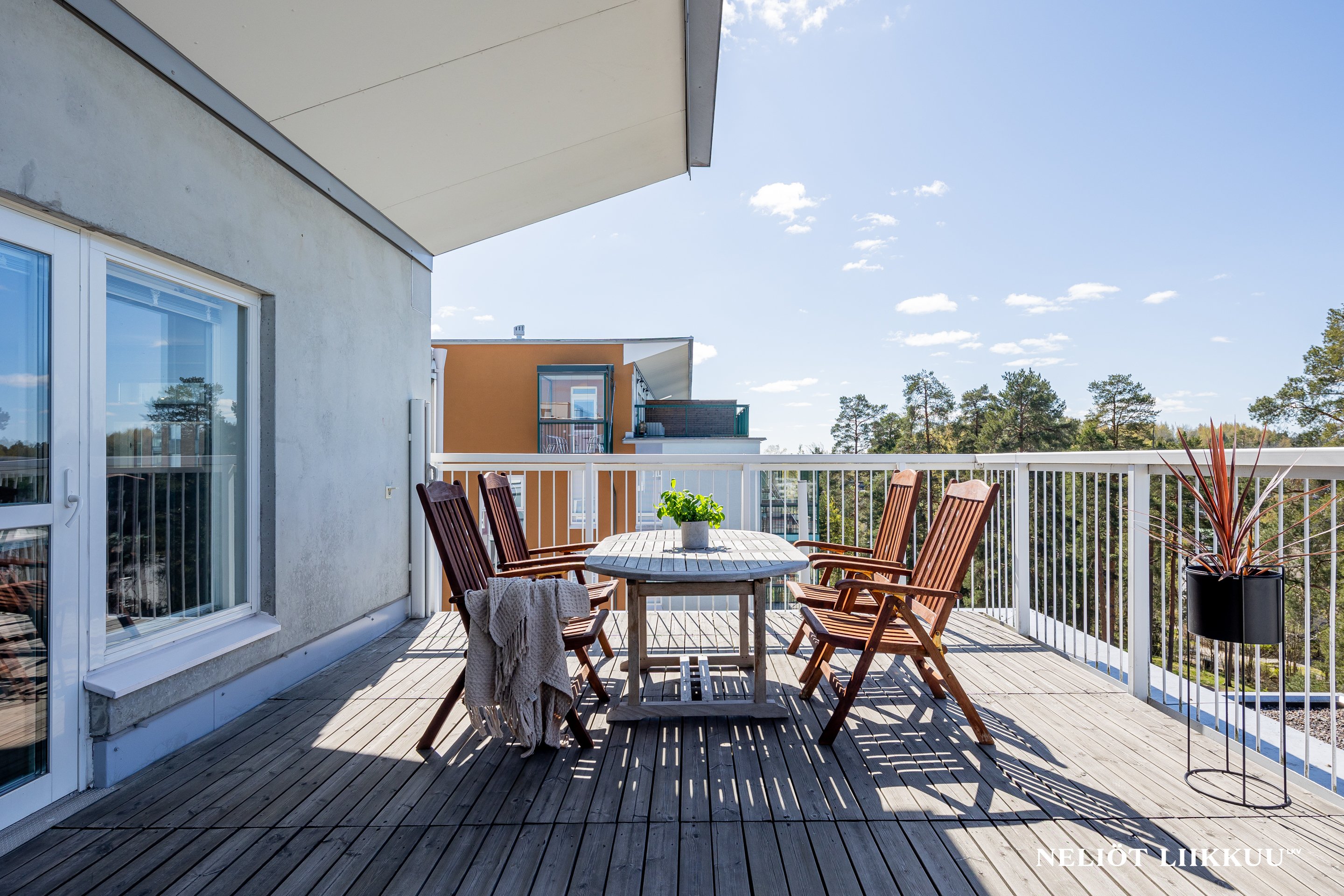 Asunnon ehdoton kruunu on oma suuri kattoterassi – täydellinen kesäparatiisi grillaamiseen, oleskeluun ja rentoutumiseen. Lisäksi käytössäsi on lasitettu aamukahviparveke, jossa päivä alkaa rauhallisesti auringon noustessa.
