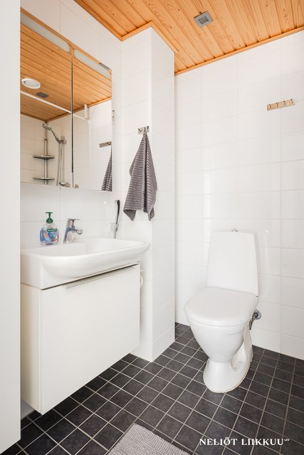 - WC-istuin, suihku, pesukoneliitäntä, lattialämmitys, ja peilikaappi
