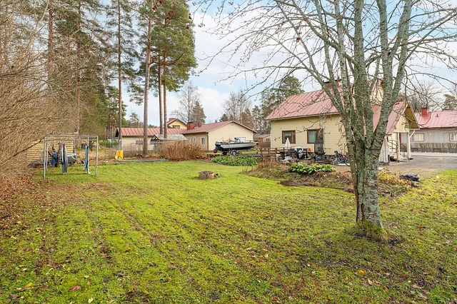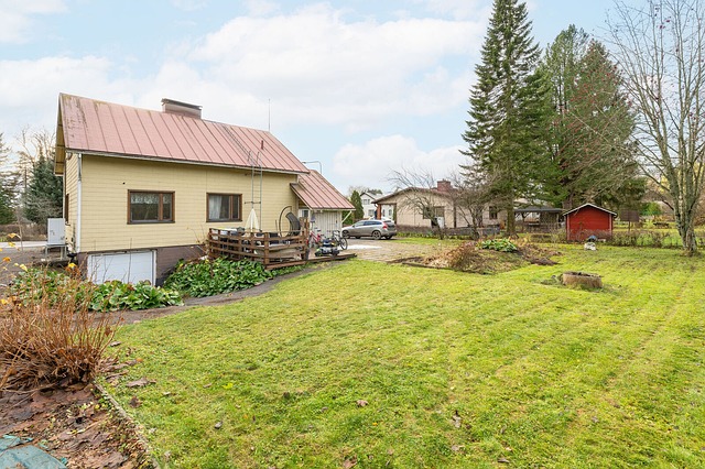 - Rakennus tontin kadun puoleisella laidalla, iso nurmikkoalue takapihana
