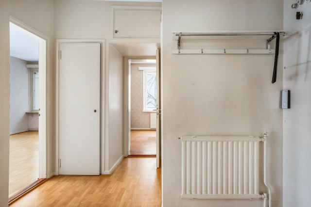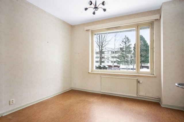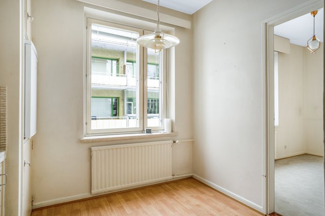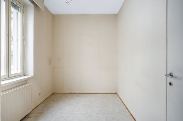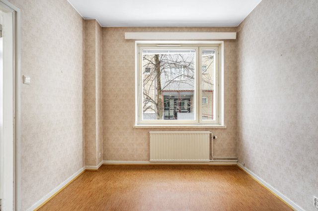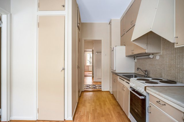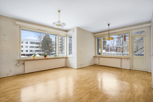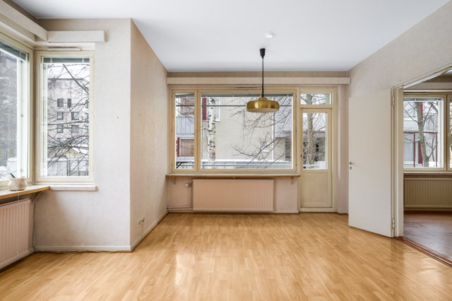 Asunnossa on kolme makuuhuonetta, joista yhtä on perinteisesti kutsuttu palvelijan huoneeksi. Tilat ovat lähes alkuperäisessä kunnossa, mikä tarjoaa loistavan mahdollisuuden joko säilyttää osittain 1950-luvun tunnelma tai päivittää koti täysin omaan makuun sopivaksi. Kylpyhuone on päivitetty jossain vaiheessa, mutta muuten asunnon pinnat huokuvat aikakauden charmia. Viimeiseksi taloyhtiön remonteista tehty kesällä 2025 parvekeremontti.