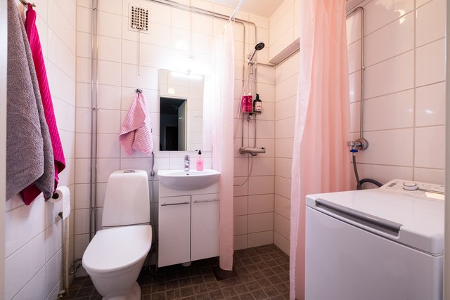 - WC-istuin, suihku, pesukoneliitäntä, peili, allaskaappi, pesuallas, ja kaareva suihkuverhotanko