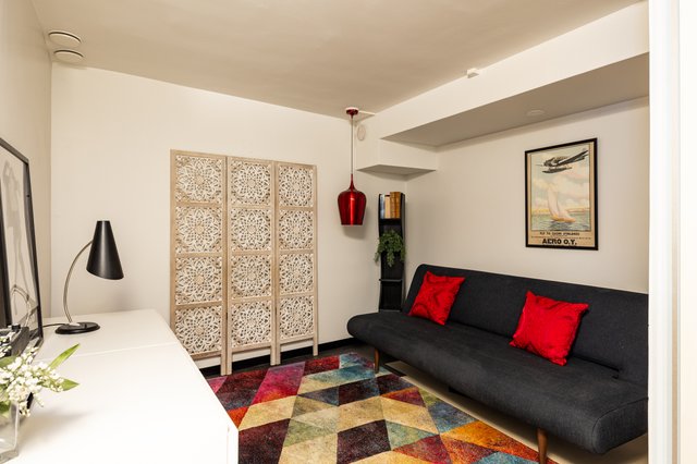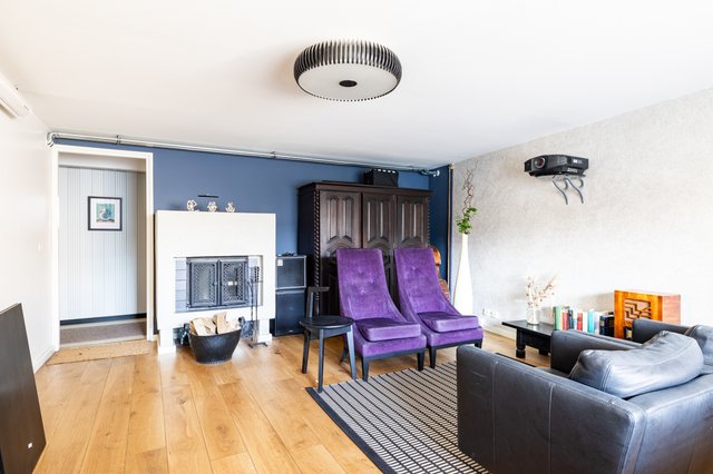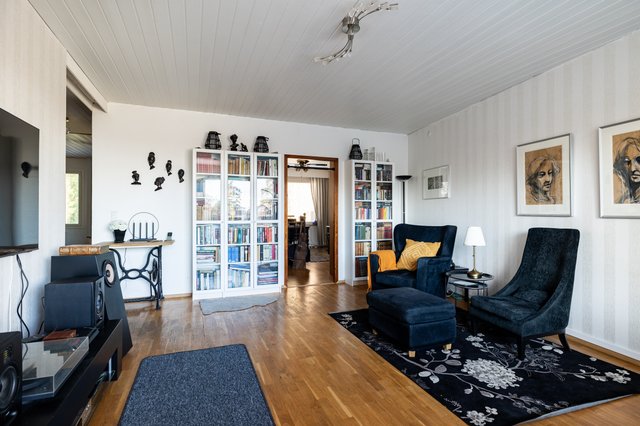 - Avarasta olohuoneesta on käynti koko huoneiston levyiselle parvekkeelle. Olohuoneen lattia on parkettia ja seinät osittain maalattu ja tapetoitu.