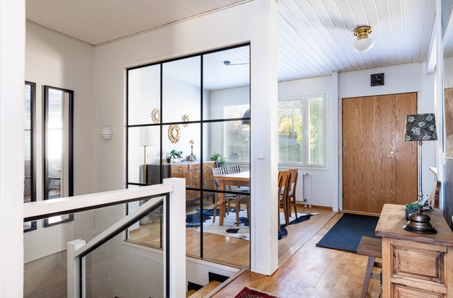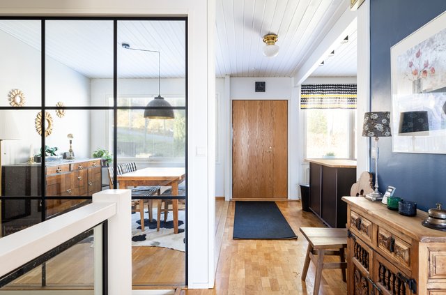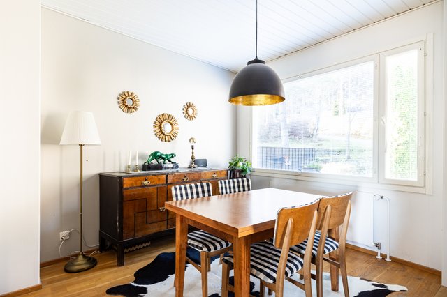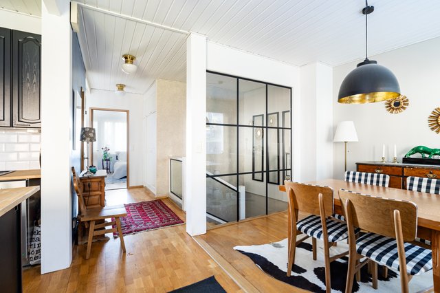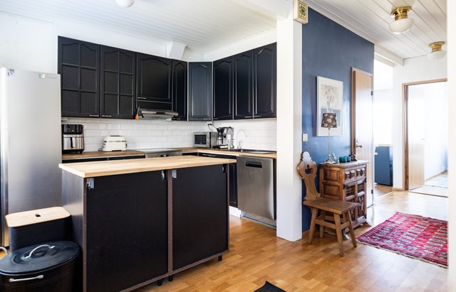 Keittiö on vuosien 2020-2024 kokenut uudistuksia. Kodinkoneet on uusittu, saareke luo avaran ja toimivan kokonaisuuden ja erilliseen ruokailutilaan mahtuu isompikin pöytä. Samaisessa kerroksessa ovat myös kodin kaksi makuuhuonetta, olohuone, sekä erillinen wc.