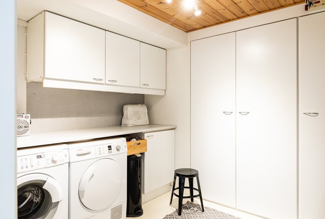 - Kodinhoitohuoneessa on tilaa pyykinkäsittelyyn, mahtuu pesukone sekä kuivausrumpu. Varustuksena kaapisto ja työskentelytaso, lattia on maalattu betoni ja seinät maalattu.
