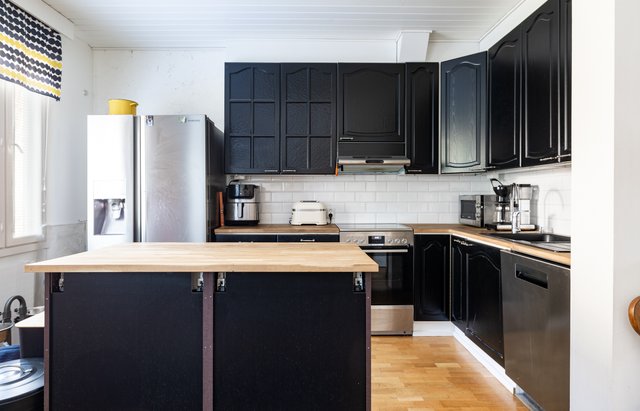 - Keittiö on uusittu vuosien 2020-2024 välillä. Kaapistot ovat maalattu, välitila laatoitettu, valaistus uusittu ja kaikki kodinkoneet uusittu. Varustuksena on keraaminen liesi/uuni, liesituuletin, astianpesukone, täyskorkeat jääkaappi, sekä pakastin jääpalakonetoiminnolla. Käytännöllinen avokeittiö saarekkeineen yhdistyy kivasti ruokailutilaan. Työtasot ovat tammea ja lattiamateriaali parketti.