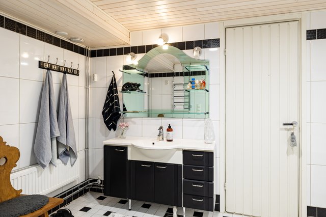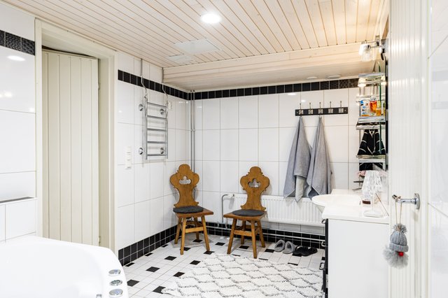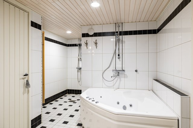 - Pesutilat ovat hulppeat ja tarjoavat saunomisen ohessa rentoutumisen poreammeessa. Poreammeen yhteydessä on suihku ja tämän lisäksi erillinen suihkunurkkaus. Pesuhuoneen lattia on laattaa ja seinät kaakeloitu.