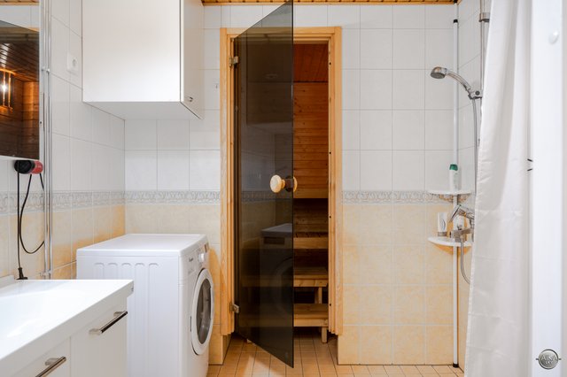 - WC-istuin, suihku, pesukoneliitäntä, lattialämmitys, peilikaappi, allaskaappi, ja bidee-suihku