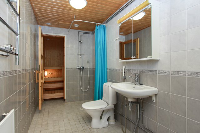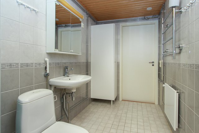 - WC-istuin, suihku, pesukoneliitäntä, peilikaappi, pesuallas, lattialämmitys, ja bidee-suihku