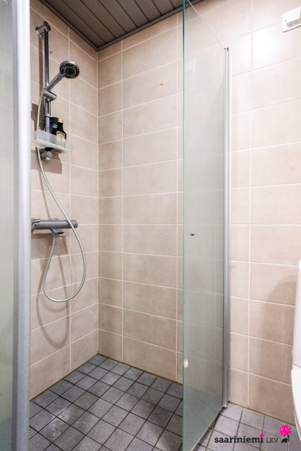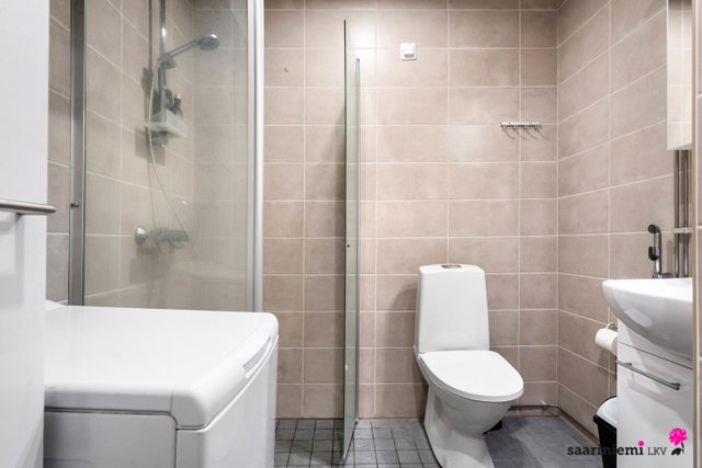 - WC-istuin, suihku, suihkuseinä, pesukoneliitäntä, lattialämmitys, peilikaappi, pesuallas, allaskaappi, ja tila pesutornille