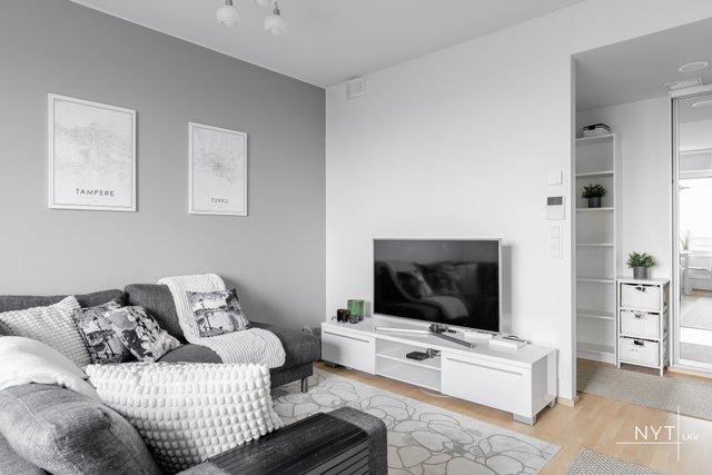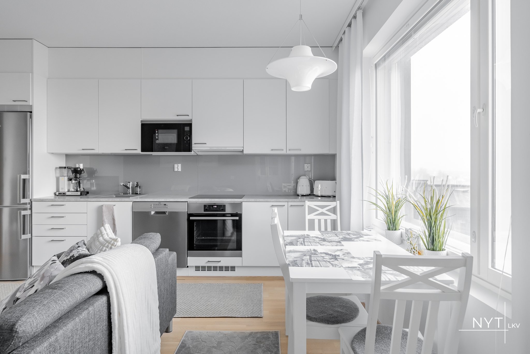 Tämä asunto tuntuu neliöitään (44,50) suuremmalta. Olohuoneen ja avokeittiön yhdistelmä on toimiva kokonaisuus. Tilaan mahtuu suurempikin sohvaryhmä ja neljänhengen ruokaryhmä. Keittiö on varusteltu rosterikodinkoneilla, induktioliedellä ja integroidulla mikrolla.