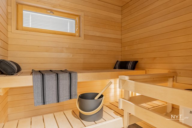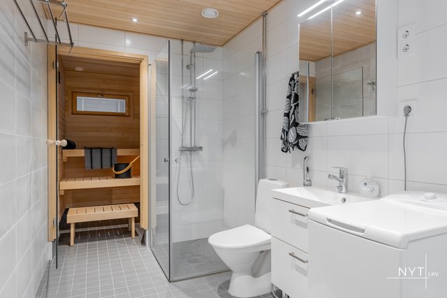 - WC-istuin, suihku (sadesuihku), suihkukaappi, pesukoneliitäntä, lattialämmitys, peilikaappi, pesuallas, allaskaappi, ja bidee-suihku