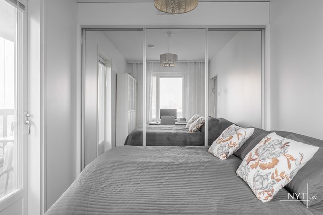 Asunnon makuuhuone on kokoluokassaan tilava ja sisältää kattavasti kaappitilaa avaruutta tuovilla peiliovilla. Huone on eroteltu olohuoneesta seinän sisään liukuvalla ovella. Makkarissa on tilaa parisängylle ja pienelle työpisteelle ja huoneesta on kulku asunnon lasitetulle parvekkeelle, joka toimii lämpiminä vuodenaikoina kuin toisena olohuoneena. Parveke on kokonsa puolesta kalustettavissa monin eri tavoin.
