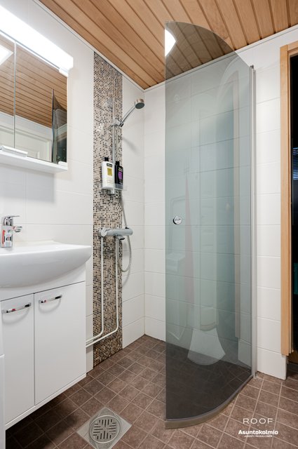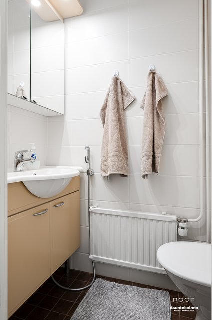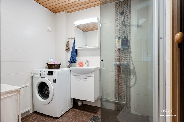- Suihku, suihkuseinä, pesukoneliitäntä, lattialämmitys, peilikaappi, pesuallas, ja allaskaappi