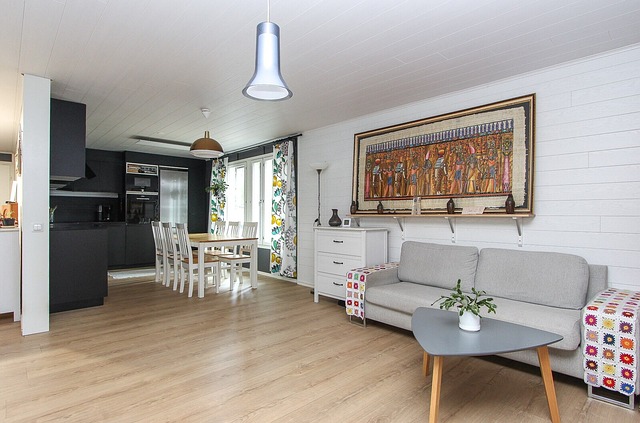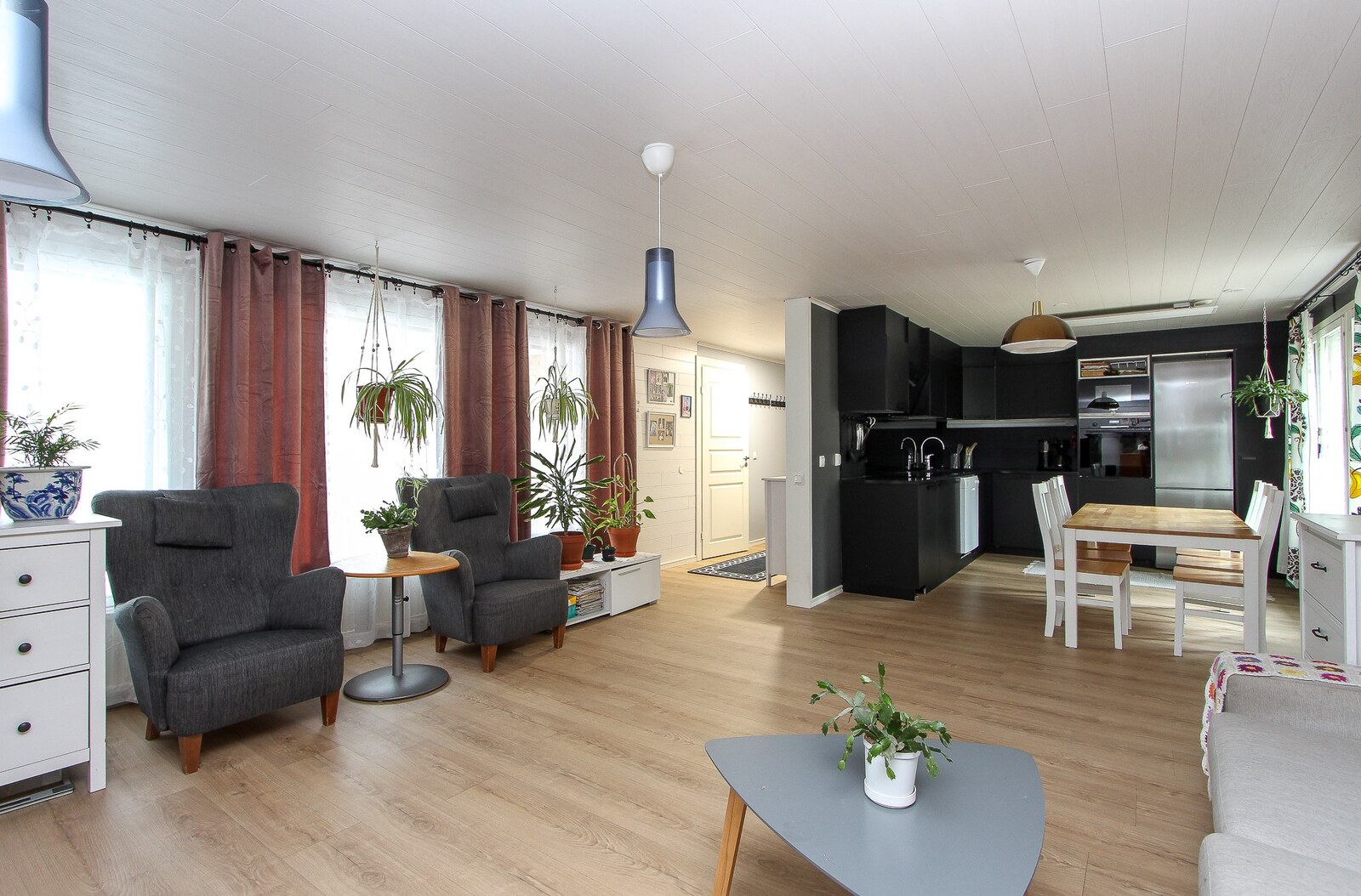 - Tyylikäs nykyaikainen keittiötila, josta seinä poistettu olohuoneen ja keittiön välistä. Useampi paikka vaihtoehto eri kokoisille ruokailupöydille.