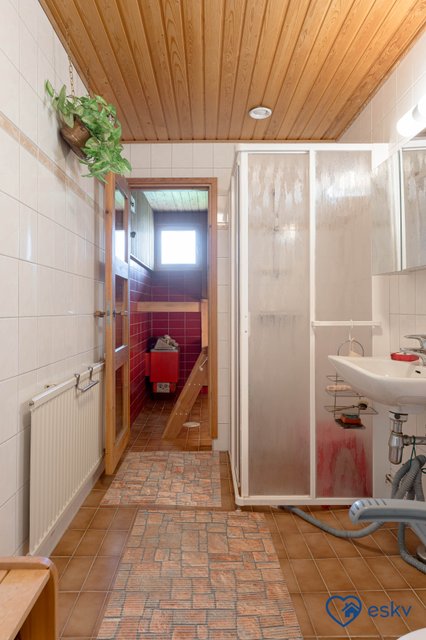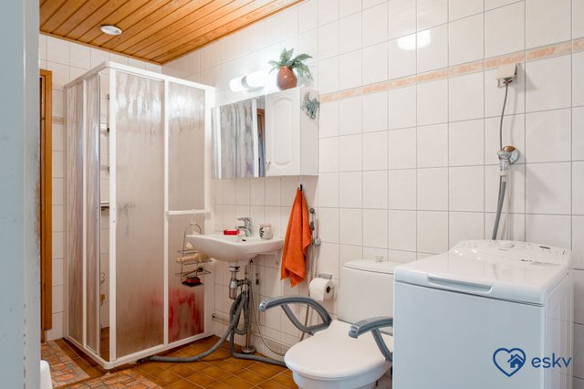- WC-istuin, suihku, suihkuseinä, pesukoneliitäntä, peilikaappi, pesuallas, ja bidee-suihku