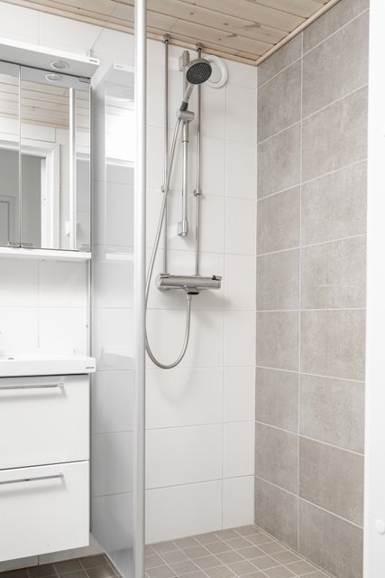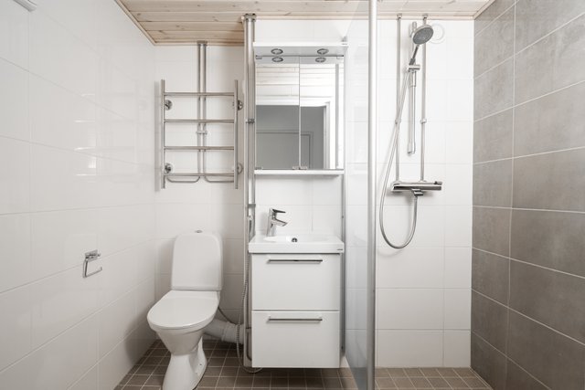 - WC-istuin, suihku, peilikaappi, lattialämmitys, allaskaappi, pesuallas, pesukoneliitäntä, ja bidee-suihku