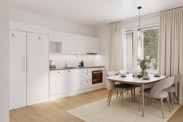 - Asunnoissa on tehdasvalmisteiset Puustellin kalusteet erillisen kalustesuunnitelman mukaisesti. Kaikissa huoneistoissa on tasoon upotettava induktiokeittotaso, kalusteisiin asennettava erillisuuni, astianpesukone, liesituuletin ja kylmälaitteet kalustesuunnitelmien mukaisesti.