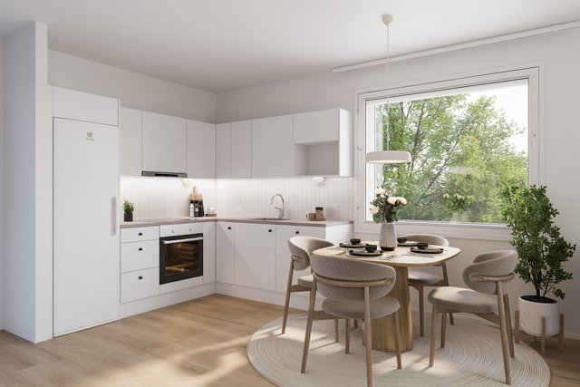 - Asunnoissa on tehdasvalmisteiset Puustellin kalusteet erillisen kalustesuunnitelman mukaisesti. Kaikissa huoneistoissa on tasoon upotettava induktiokeittotaso, kalusteisiin asennettava erillisuuni, astianpesukone, liesituuletin ja kylmälaitteet kalustesuunnitelmien mukaisesti.