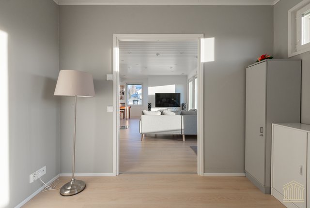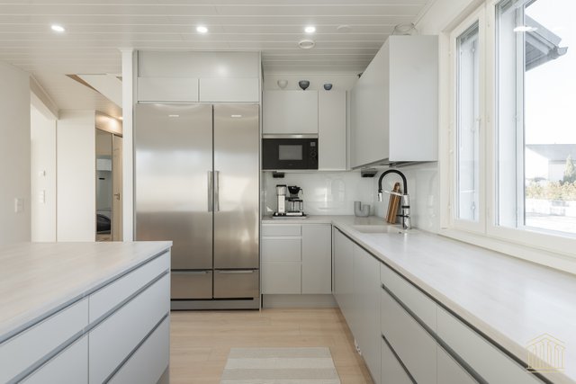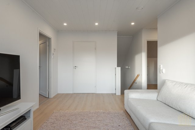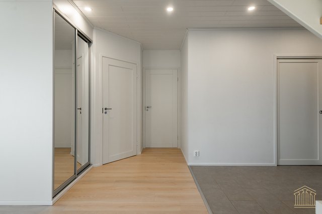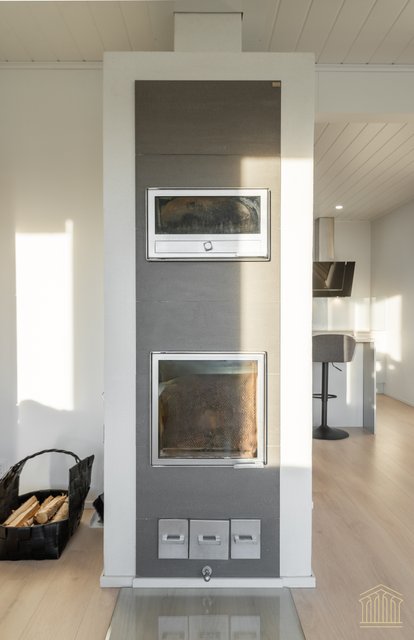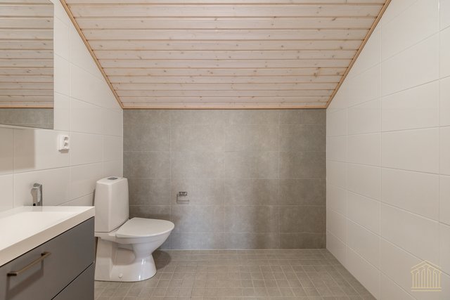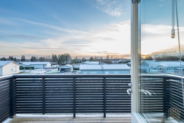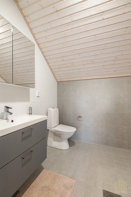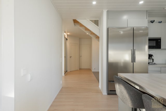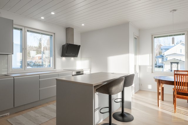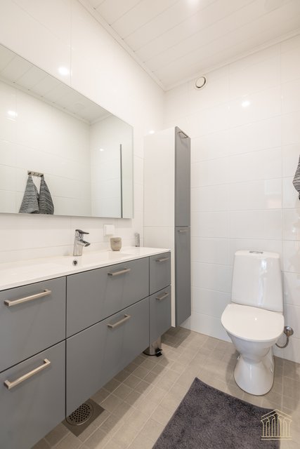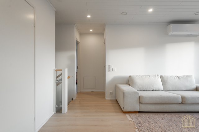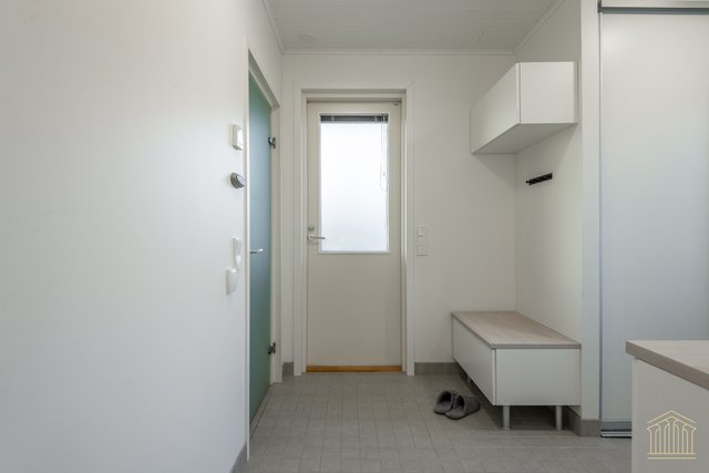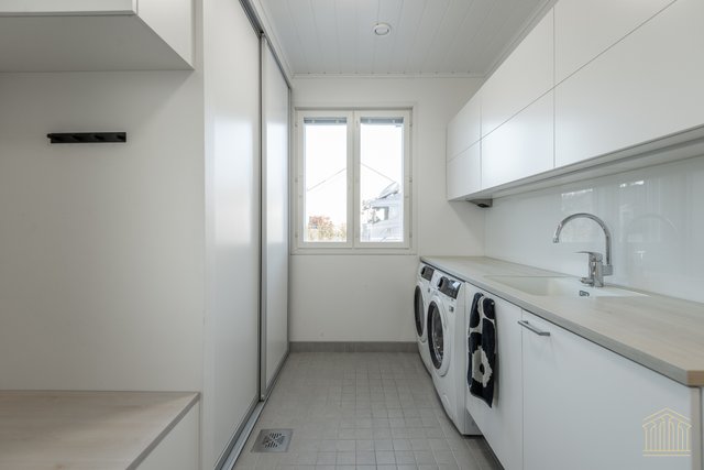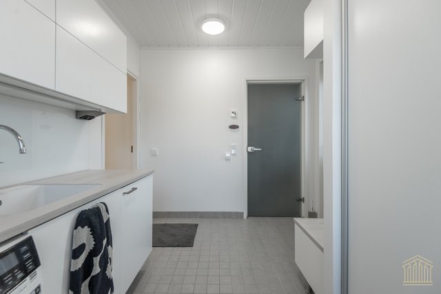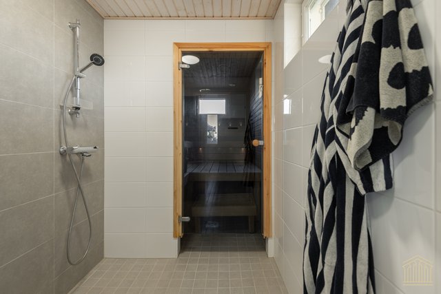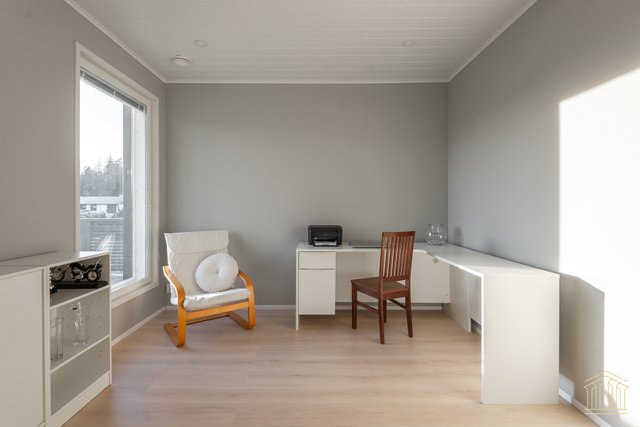 Arkea sujuvoittaa tilava kodinhoitohuone omalla uloskäynnillä. Kahden suihkun kylpyhuone, työtasot ja paikat pesukoneelle ja kuivausrummulle ovat kaikki tärkeitä yksityiskohtia. Alakerran makuuhuoneen lisäksi yläkerrasta löytyy vielä kolme huonetta lisää sekä toiminnallinen aula, joka toimii niin lapsilla kuin aikuisillakin. Kaksi erillistä wc:tä ylä- ja alakerrassa. Koko asunnon molemmat kerrokset kattaa vesikiertoinen lattialämmitys. Kesäpäiviä viilentää yläkerrassa oleva ilmalämpöpumppu.